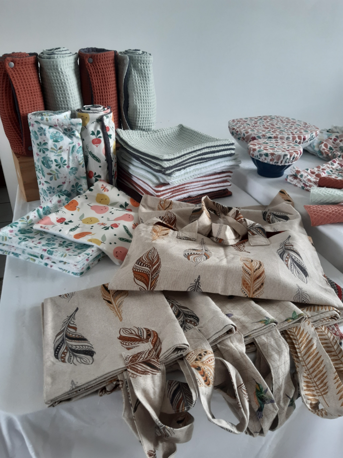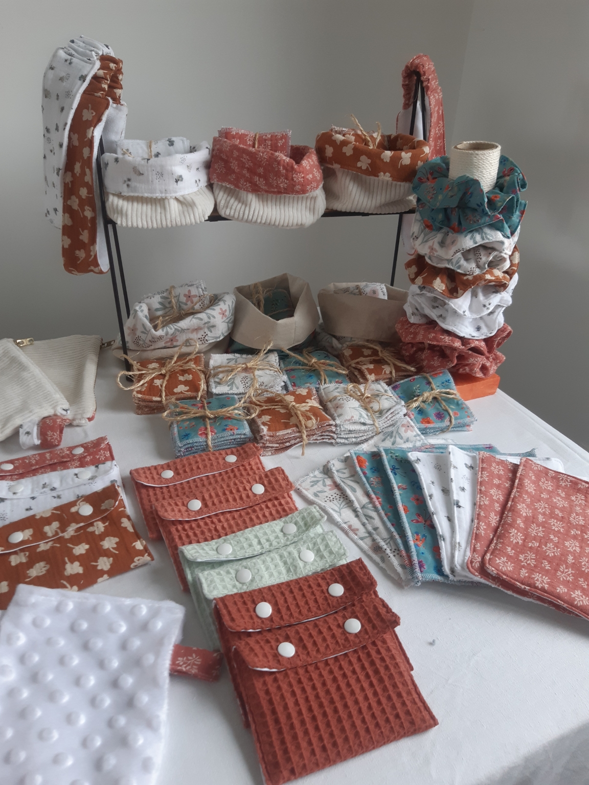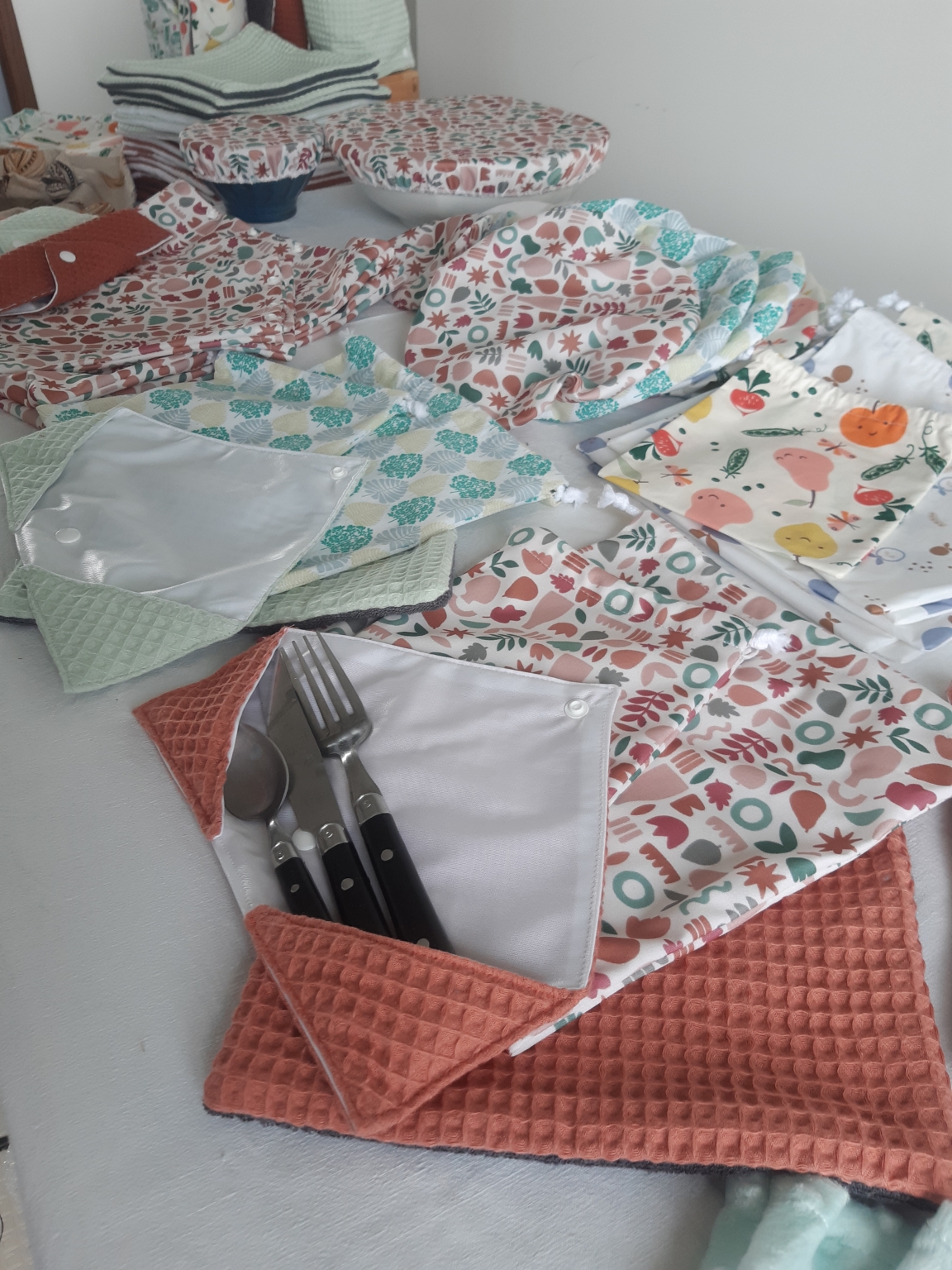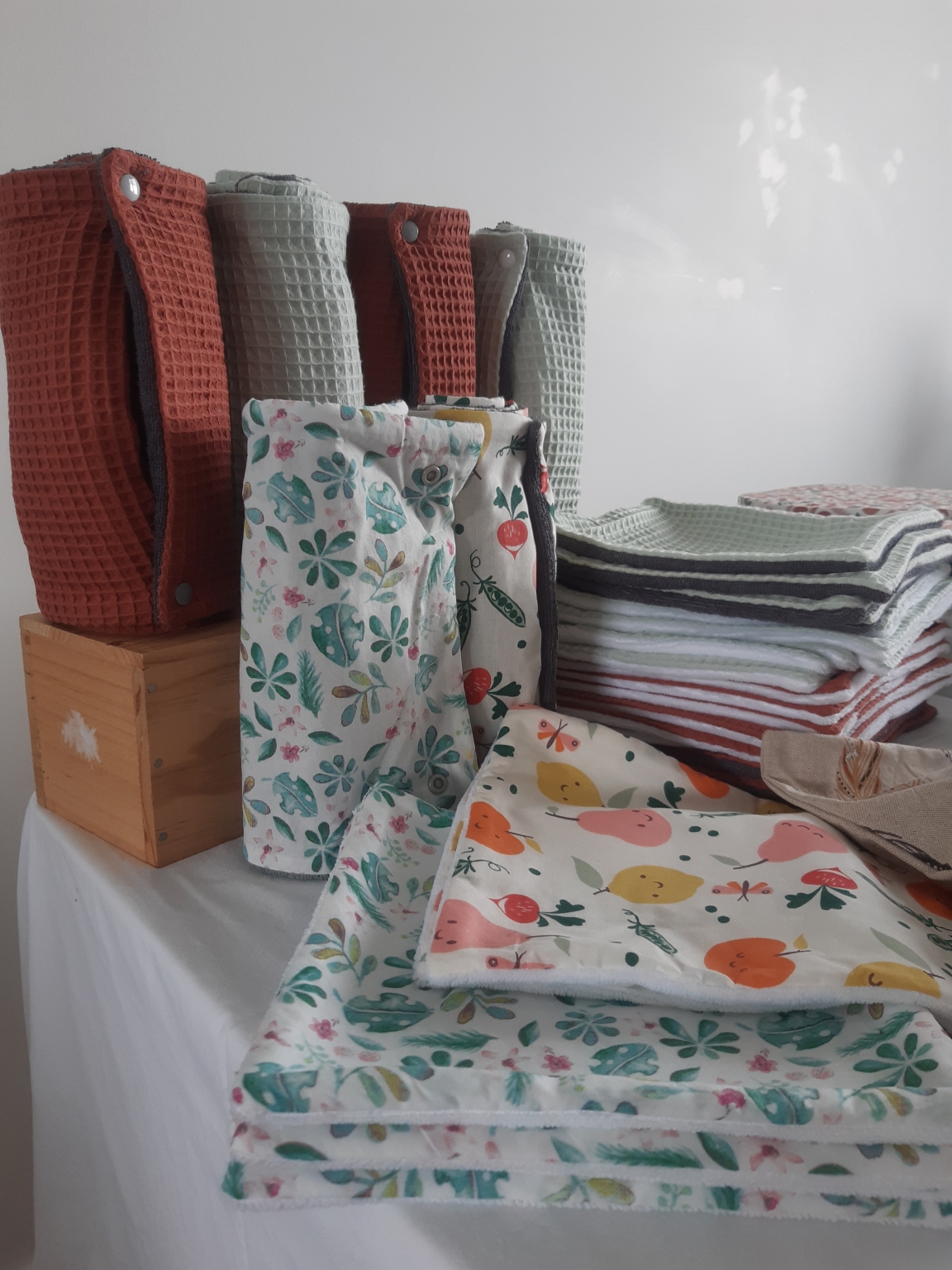 Dans mon atelier, je confectionne à la main des accessoires du quotidien plus durables : lingettes lavables, essuie-tout réutilisables, charlottes pour plats, sacs cadeaux en tissus…